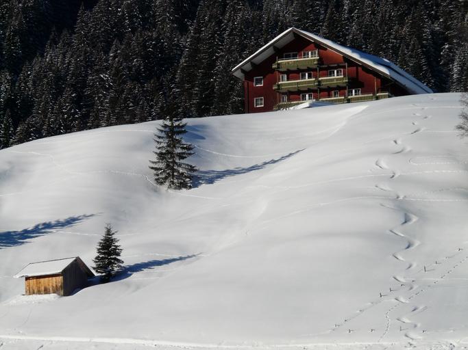 Keywords: skiing trace wag traces in the snow ski lodge hut winter landscape snowy idyllic quiet fir wintry
