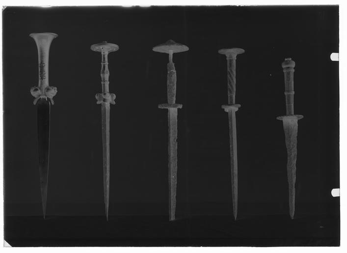 Keywords: Skivdolk - Livrustkammaren - 77366-negative.tif Sammansatt av ursprungligen ej samhörande delar Klingan sannolikt från sen medeltid Kavel av sengotisk typ Knapp och parerplåt sentida 1830-50 Monteringen av de olika delarna till av allt att döma utförd under sistnämnda tid Fäste av mässing Knapp pålödd kaveln och av rund vertikalt hoptryckt form utmed mitten bård hålkäl Nitknappen som är platt och med ojämnt flersidig kontur utgör huvudet till en i knappen inskruvad kort skruv Kavel koniskt avsmalnande mot klingbasen Rund överdelens mitt och nederdel en snedräfflad ring Mellan dessa ett yttäckande mönster av stående rektangulära fält med rut- och kryssmönster i låg relief och med spår av påhamrat silver Parerplåt slät rundat skivformig och vågrät utskjutande på vapnets utsida utmed kanten bård av runda hål Parerplåtens insida liten bredd 18mm rakt nedåtböjd och formad som en palmett Klinga tvåeggad illa medfaren och täckt av gravrost Eggsidorna ojämna mycket skadade Jordfynd original caption skivdolk - LRK 17153 ca other date - 1400 1850 brass b1 - blankvapen - fäste material mässing - silver b4 - blankvapen - fästdekor material silver size mm 272 size mm 45 size mm 168 klinga size mm 25 klinga g 190 LRK Alexander E C G von Post Kapten 1843-1899 Stora Djulö Sverige place of origin original filename LN_B00339_003219 52444 inventory number LRK 17154 77366 CC0 Skivdolk - Livrustkammaren - 77366 tif <gallery caption Different images of same object > File Dolk sammansatt - Livrustkammaren - 17594 tif </gallery> |