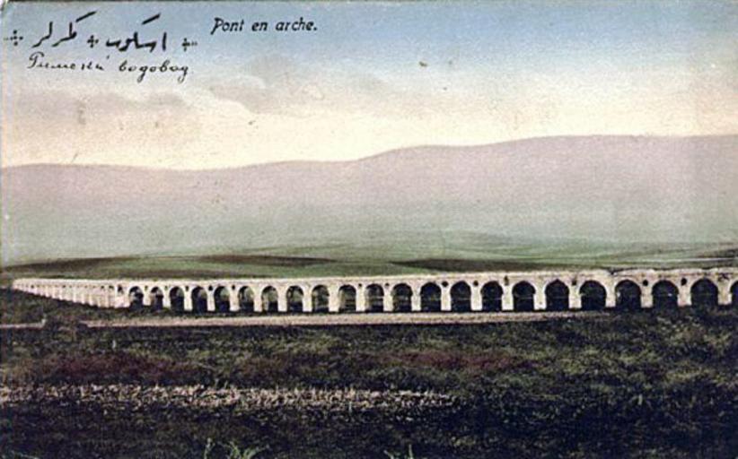 | Keywords: Skopski akvedukt razglednica.jpg mk Коло фотог афија азгледница од 1902 - 1905 година на се опфатени околу 40 основни сводови и пове е засводени олеснувачки отво и над столбовите од кои најмалку 8 се со тимпанони а над нив по целокупната должина на акведуктот е егист и ан венец и над него западниот челен ѕид на водоводниот канал а левиот агол од фотог афијата азгледницата десно од ту скиот натпис е напишано Pont en arche што е ече ост со лакови а под ту скиот натпис е запишано Римски водовод Colour postcard of the Skopje Aqueduct from the early 20th century http //www cdnh edu mk/Proekti/diplomski/akvedukt/istorija5 html Dead link author 1902 Anonymous-EU Skopje Aqueduct Postcards of Skopje Colored postcards |