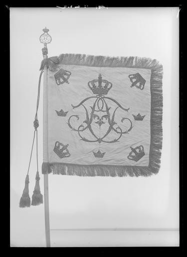 Keywords: Skvadronstandar Borgerskapets kavalleri - Livrustkammaren - 35654.tif Duk av dubbel röd sidendamast mycket blekt med mönster bestående av ett yvigt lövverk Mönsterrapport på damasten b 235 mm x h 420 mm Dekor broderat på utsidan Adolf Fredriks namnchiffer spegelmonogram A F under sluten kunglig krona nedtill omgiven av två lagerkvistar hopknutna med rosett alltihop i läggsömsbroderi i silver Namnchiffret i kronans höjd 470 mm av fyra rosor i applicerad blå taft med påsydda motiv i blått och silver Frans enkel av metall Duken fäst med tre rader tennlickor på band Stång av trä kannelerad vitmålad och förgylld järnbeslagen Löpande bärring Holk av förgylld mässing Avsågad original caption 1763 iron - silver - gold - metal - wood Färg vit material trä size mm 10 band size mm 350 grepp size mm 710 size mm 670 size mm 60 frans size mm 3150 stång total size mm 80 holk LRK place of origin original filename LN_B11224_014104 53620 inventory number LRK 17079 35654 CC0 Skvadronstandar Borgerskapets kavalleri - Livrustkammaren - 35654-negative tif <gallery caption Different images of same object > File Skvadronstandar Borgerskapets kavalleri - Livrustkammaren - 43207 tif File Skvadronstandar Borgerskapets kavalleri - Livrustkammaren - 68893 tif </gallery> Heraldic flags Media contributed by LSH unmatched material Media contributed by LSH dim-with multiple size templates Media contributed by LSH 2013-10
