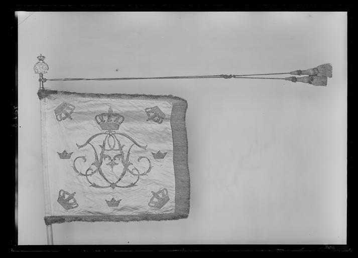 Keywords: Skvadronstandar Borgerskapets kavalleri - Livrustkammaren - 68893.tif Duk av dubbel röd sidendamast mycket blekt med mönster bestående av ett yvigt lövverk Mönsterrapport på damasten b 235 mm x h 420 mm Dekor broderat på utsidan Adolf Fredriks namnchiffer spegelmonogram A F under sluten kunglig krona nedtill omgiven av två lagerkvistar hopknutna med rosett alltihop i läggsömsbroderi i silver Namnchiffret i kronans höjd 470 mm av fyra rosor i applicerad blå taft med påsydda motiv i blått och silver Frans enkel av metall Duken fäst med tre rader tennlickor på band Stång av trä kannelerad vitmålad och förgylld järnbeslagen Löpande bärring Holk av förgylld mässing Avsågad original caption 1763 iron - silver - gold - metal - wood Färg vit material trä size mm 10 band size mm 350 grepp size mm 710 size mm 670 size mm 60 frans size mm 3150 stång total size mm 80 holk LRK place of origin original filename LN_B01198_004078 53620 inventory number LRK 17079 68893 CC0 Skvadronstandar Borgerskapets kavalleri - Livrustkammaren - 68893-negative tif <gallery caption Different images of same object > File Skvadronstandar Borgerskapets kavalleri - Livrustkammaren - 43207 tif File Skvadronstandar Borgerskapets kavalleri - Livrustkammaren - 35654 tif </gallery> Heraldic flags Media contributed by LSH unmatched material Media contributed by LSH dim-with multiple size templates Media contributed by LSH 2013-10 |