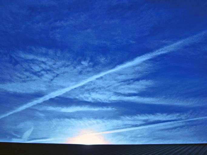 Keywords: sky blue bright clouds lines streaks white glistening roof streaky sky