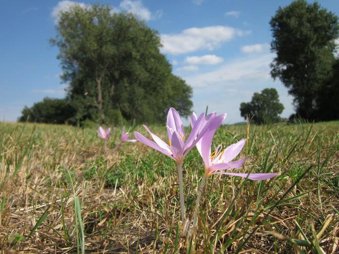 Keywords: sky clouds trees colchicum autumnale plant plants flower flowers greenery flora herbage bloom blossom floret stem stalk beautiful beauty bright colorful bold deep intense nature outside outdoors spring summer lovely radiant pretty