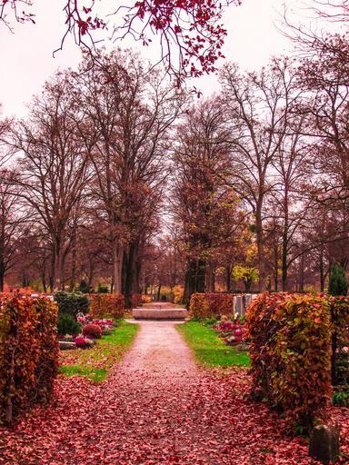 Keywords: sky munich cemetery garden nature flowers plant grass green tree landscape tombstone grave death candle leaves leaf autumn colorful red