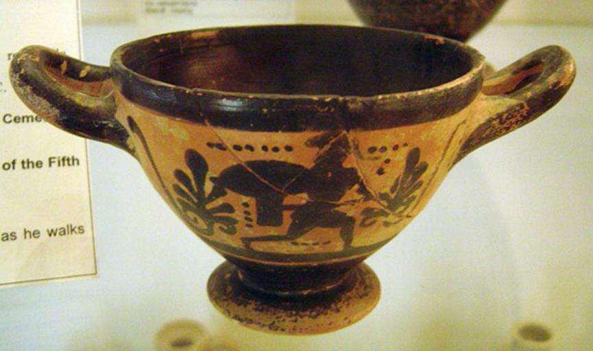 Keywords: Skyphos hoplite.jpg Attic skyphos in black figure depicting hoplite soldier looking back as he walks Circa 490-480 BC; excavated at Contrada Pezzino cemetery Agrigento Sicily own 2006-04-30 User ChrisO Ancient Greek pottery skyphoi Hoplites in ancient Greek pottery 490s BC pottery Ancient Greek pottery from Agrigento Attic black-figure pottery |