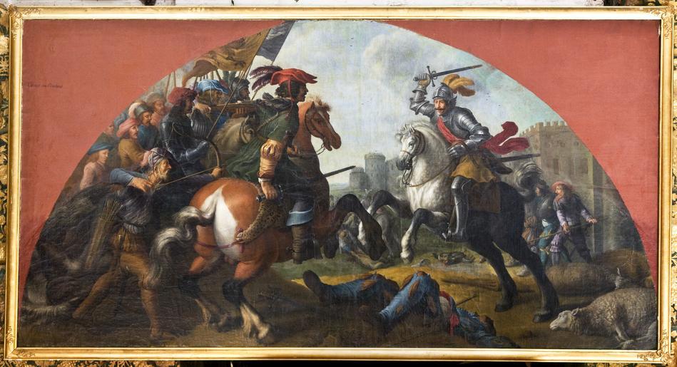 Keywords: Slaget vid Roskilde 1154. Randalf slår Venderna. Måleri. Historiebild - Skoklosters slott - 85994.tif Till vänster ryttare i grön dräkt och röd barett med fjädrar anförande fotfolk Till höger ryttare i hel rustning på vit häst I bakgrunden till höger stadsmur <br/>Rektangulär duk halvcirkelformig målning övre svicklarna målade i rödbrun färg Största delen av halvcirkeln upptas av ett halvt fyrpass med tjockare målning i klarare färger än resten som är mer skissartad 1600- talsövermålning På baksidan är fyrpassformen markerad genom stygn sydda genom duken Frott <br/>Signerad Adriaen van Nieulandt Anno 1643 <br/>Kilad spännram <br/>Förgylld ram av furu enkla hörnornament av förgyllt bly tidigt 1800- tal På baksidan av ramens alla delar skrivet med rödkrita No 1 Ramlistens bredd 70 mm original caption Slaget vid Roskilde 1154 Randalf slår Venderna Måleri Historiebild <br/> Nyckelord Tavla Krig Randalf Målning Hästar Ryttare Rustning Venderna Ram Föremålsbild 1643 oil on canvas size mm 1645 3150 SKO Carl Gustaf Wrangel place of origin original filename sm_dig4011 23239 inventory number SKO 1953 85994 PD Jens Mohr <gallery caption Different images of same object > File Interiör Gröna sängkammaren Danska historien Målningar - Skoklosters slott - 33657 tif </gallery> Jens Mohr Horses Armour in art Media contributed by LSH unmatched objKeyword Media contributed by LSH unmatched creator Media contributed by LSH unmatched keyword Media contributed by LSH 2013-10