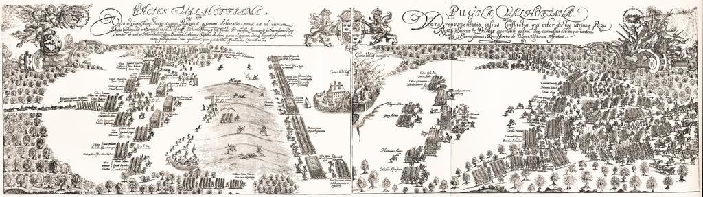 | Keywords: Slaget vid Wallhof 1628 SP230.jpg en Battle of Wallhof sv Slaget vid Wallhof 1626 Två titlar i jämbredd Acies Valhoffiana hoc est Vera utriusq ue tam Sveticæ quam Polonicæ acierum delineatio; prout eæ ad curiam Ducis Curlandiæ in Semigallia Walhoff dictam Anno 1626 die 4/17 mensis Januarij á Serenissimo Rege Sveciæ av una et Mareschallo Magni Ducatus Lithuaniæ Sapieha ab altera parte; ad pugnam utrinq ue dispositæ fuerunt; una cum præcipuorum tam equistrium quam pedestrium Officialium nominibus Svenska krönta riksvapnet med lejon till sköldhållare Pugna Valhofiana sive Vera repræsentatio ipsius Conflictus qui inter dictos utriusq ue Regis Regniq ue Sueciæ Poloniæ exercitus eodem die commissus est in quo tandem Serenissimus Rex Sueciæ de Polono Victoriam reportavit Under hvardera af ofvannämnda titlar motsvarande framställning slagordningen och själfva sammandrabbningen som slutar med polackarnes oordnade flykt I öfre hörnet t v Fama kring hvars basun läses Eur 1 Fortia facta velox volitans fert fama per Orbem I motsvarande hörn t h Segergudinnan med palm och lagerkrans den senare omgifven af följande vers Victor eris moderante Deo et victricibus armis Lång kopparstickstafla hopsatt af två stycken tillsammans 290 mm x 1 meter 70 mm - Detta högst märkliga blad hvaraf något annat exemplar icke är kändt skänktes till K Bibl af Frih A E Nordenskiöld som anträffadt detsamma i ett band gamla kartor Bildbeskrivning Snoilsky Historiska planscher Ny uppl Unknown date http //libris kb se/bib/544922 Unknown engraver other versions Battles PD-old |