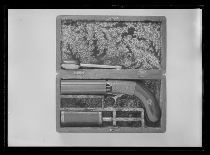 | Keywords: Slaglåsrevolver, sexpipig, s.k - Livrustkammaren - 34840.tif Pipknippe av brunerat stål sex slätborrade pipor vid mynningen stämplat 8 Axelskruv med blånerat huvud I bakänden inskruvat blånerade tändhattsnipplar <br/><br/>Rund låda av brunerat stål med graverad rankdekor på ovansidan oval stämpel text MOLANDER // MOTALA Ursprungligen blånerad ringformig avtryckare blånerad hake som spänner det blånerade slagstycket placerat på undersidan framför avtryckaren Låsdelar och kolvram stämplade 8 På lådans v sida ett lock som kan avlägsnas när kolvplattan tagits bort <br/><br/>Rundad böjd kolv med ram i ett med lådan graverad rankdekor på ryggen på änden en stjärna Kolvplattor av valnöt fästade med skruv från v sida Blånerade skruvplattor original caption ca 1850 steel e127 - eldvapen - pipa lås och stockbeslag material stål - walnut e3 - eldvapen - stock material valnöt size mm 199 size mm 87 pipa size mm 90 g 600 LRK MOLANDER MOTALA N A Molander place of origin original filename LN_B03074_005954 40931 inventory number LRK 4347 34840 CC0 Slaglåsrevolver sexpipig s k - Livrustkammaren - 34840-negative tif Percussion revolvers Revolvers images from Livrustkammaren Media contributed by LSH dim-with multiple size templates Media contributed by LSH unmatched creator Media contributed by LSH unmatched objKeyword Media contributed by LSH 2013-10 |