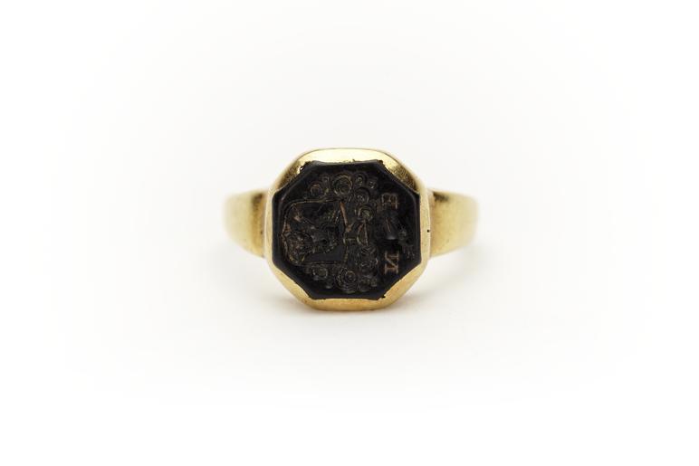 | Keywords: Slät ring av guld med åttsidig, svart sten - Skoklosters slott - 92274.tif LSH artwork sv Skuret signet i form av vapensköld med rovfågel matande sina ungar på redet Hjälmprydnaden duva med olivkvist Initialerna N B <br/>1600-talets slut original caption Slät ring av guld med åttsidig svart sten <br/> Nyckelord 1600-tal Ring Ringar Smycke Smycken Sigillstamp Signetringar Guld Sten Föremålsbild Stämpel - 1675 1700 size mm 19 14 SKO Magnus Brahe greve riksmarskalk N B place of origin original filename sm_dig8620 21452 inventory number SKO 291 92274 CC-BY-SA Erik Lernestål Stone Stamping Gold Signet rings Erik Lernestål Media contributed by LSH 2014-11 |
