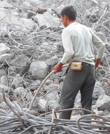 Keywords: Sledgehammer with very flexible handle - 01.jpg en Workers extracting rebar and other metal from concrete rubble at building demolition site Haikou City Hainan Province China 2012-04-27 own Anna Frodesiak cc-zero Uploaded with UploadWizard Rebar Sledgehammers Files by User Anna Frodesiak Rubble
