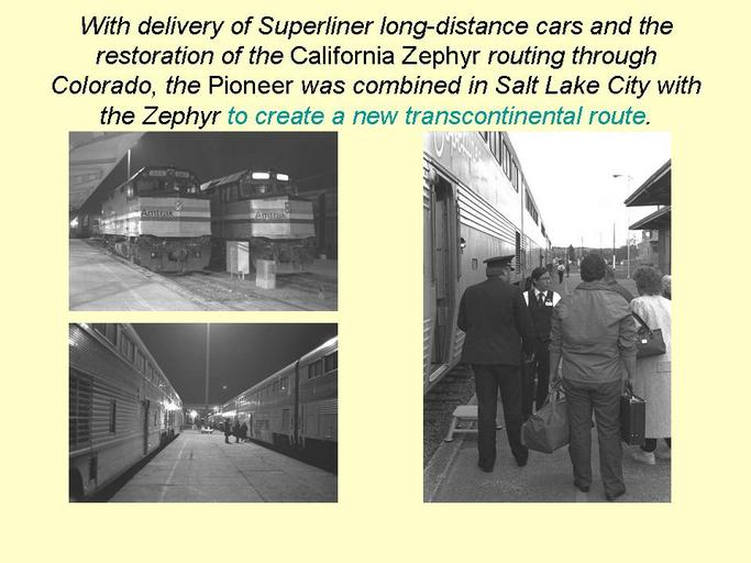 | Keywords: amtrak pioneer carter reagan oregon idaho wyoming colorado amfleet train eisenbahn fernzug text Dubbed "the little train that could" the cost-effective Amtrak Pioneer survived Carter and Reagan cutbacks. With the arrival of new Superliner cars and rerouting of the Zephyr connection, Salt Lake City became the "crossroads of the West" for Amtrak. Dubbed "the little train that could" the cost-effective Amtrak Pioneer survived Carter and Reagan cutbacks. With the arrival of new Superliner cars and rerouting of the Zephyr connection, Salt Lake City became the "crossroads of the West" for Amtrak. |