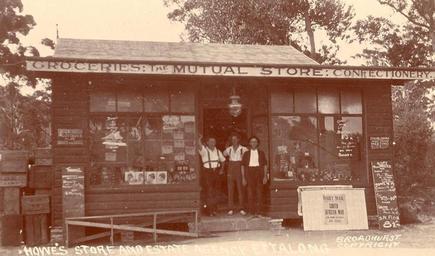 | Keywords: SLNSW 796323 Howes Store and Estate Agency Ettalong.jpg Photographs 1073 postcards silver gelatin photoprints b w and hand col ; 8 8 x 14 cm -14 x 8 8 cm ; Ephemera 1 pamphlet William Henry Broadhurst was born at Maitland on 13th August 1855; he died aged 72 on 29 July 1927 He moved to Ashfield Sydney and began employment as a surveyor's assistant working mainly on the south coast of NSW He turned his interest in photography into a business and from around 1900 began to publish postcards Many of the photographs were hand coloured for sale by his daughters To secure his photographs he travelled by train and then walked wherever he wanted to go -- Reference source Illawarra Historical Society Bulletin September 1970 pp 2-3 PXA 635/1071 Presented 1970; Pic Acc 2048 For access to this material please contact the Head of Pictures Section - M A B often appears on the front of Broadhurst postcards The name M Broadhurst also appears on the back of some postcards eg PXA 635/179 The identity and significance of this anomaly is unknown This collection has been arranged by geographical location You may navigate from this collection record to these individual records 796323 Howe's Store and Estate Agency Ettalong Postcards of New South Wales Ettalong New South Wales |
