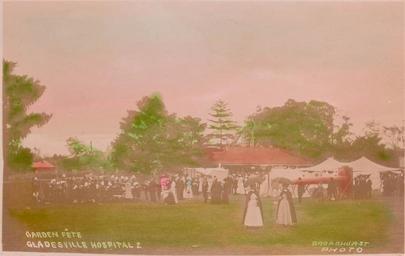 Keywords: SLNSW 796339 Garden fete Gladesville Hospital.jpg Photographs 1073 postcards silver gelatin photoprints b w and hand col ; 8 8 x 14 cm -14 x 8 8 cm ; Ephemera 1 pamphlet William Henry Broadhurst was born at Maitland on 13th August 1855; he died aged 72 on 29 July 1927 He moved to Ashfield Sydney and began employment as a surveyor's assistant working mainly on the south coast of NSW He turned his interest in photography into a business and from around 1900 began to publish postcards Many of the photographs were hand coloured for sale by his daughters To secure his photographs he travelled by train and then walked wherever he wanted to go -- Reference source Illawarra Historical Society Bulletin September 1970 pp 2-3 PXA 635/1071 Presented 1970; Pic Acc 2048 For access to this material please contact the Head of Pictures Section - M A B often appears on the front of Broadhurst postcards The name M Broadhurst also appears on the back of some postcards eg PXA 635/179 The identity and significance of this anomaly is unknown This collection has been arranged by geographical location You may navigate from this collection record to these individual records 796339 Garden fete Gladesville Hospital Postcards of New South Wales Gladesville Mental Hospital |