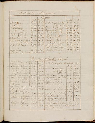 | Keywords: SLNSW 797979 Latitudes and longitudes.jpg Aggregated Collection Textual Records Graphic Materials The First Fleet consisting of 11 vessels was the largest single contingent of ships to sail into the Pacific Ocean Its purpose was to found a convict settlement on the east coast of Australia at Botany Bay ; The First Fleet sailed from England on 13 May 1787 carrying more than 1 500 people and arrived at Botany Bay eight months later on 18 January 1788 Governor Arthur Phillip rejected Botany Bay choosing instead Port Jackson to the north as the sight for the new colony; they arrived on 26 January 1788 The Fleet consisted of two naval escorts HMS Supply and the flagship HMS Sirius carrying the Governor; six convict transports the Alexander Charlotte Friendship Lady Penrhyn Prince of Wales and the Scarborough; and three storeships the Borrowdale Fishburn and Golden Grove This selection comprises ten of the eleven known First Fleet journals including two versions of Philip Gidley King's journal; and correspondence and artworks of First Fleeters First Fleet 1787-1788 ; New South Wales -- History -- 1788-1851 797979 Latitudes and longitudes Journal of William Bradley |