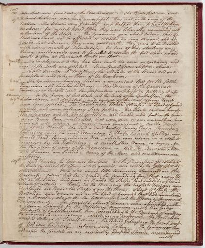 | Keywords: SLNSW 811242 p21.jpg Aggregated Collection Textual Records Graphic Materials The First Fleet consisting of 11 vessels was the largest single contingent of ships to sail into the Pacific Ocean Its purpose was to found a convict settlement on the east coast of Australia at Botany Bay ; The First Fleet sailed from England on 13 May 1787 carrying more than 1 500 people and arrived at Botany Bay eight months later on 18 January 1788 Governor Arthur Phillip rejected Botany Bay choosing instead Port Jackson to the north as the sight for the new colony; they arrived on 26 January 1788 The Fleet consisted of two naval escorts HMS Supply and the flagship HMS Sirius carrying the Governor; six convict transports the Alexander Charlotte Friendship Lady Penrhyn Prince of Wales and the Scarborough; and three storeships the Borrowdale Fishburn and Golden Grove This selection comprises ten of the eleven known First Fleet journals including two versions of Philip Gidley King's journal; and correspondence and artworks of First Fleeters First Fleet 1787-1788 ; New South Wales -- History -- 1788-1851 811242 p 21 Journal of George Bouchier Worgan |