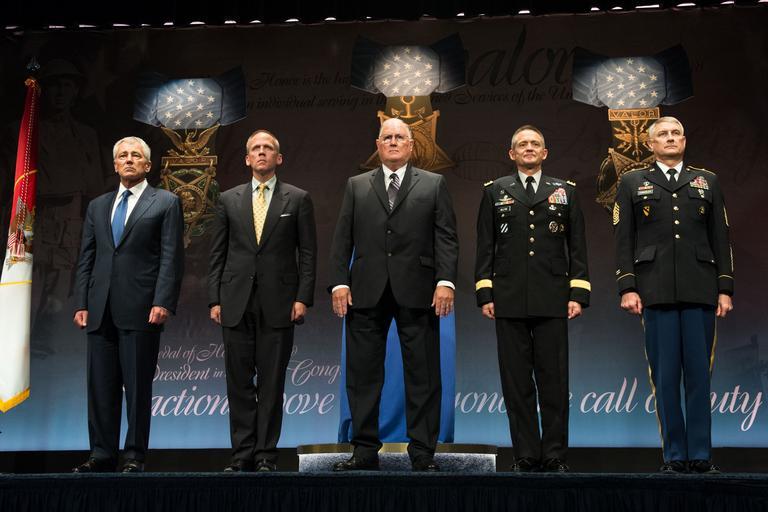Keywords: Sloat Medal of Honor 140916-D-AF077-390.jpg en From left Secretary of Defense Chuck Hagel; Brad Carson the undersecretary of the U S Army; William Sloat the brother of Spc 4 Donald P Sloat; Gen Daniel Allyn the vice chief of staff of the Army; and Sgt Maj Raymond Chandler the sergeant major of the Army attend a ceremony during which Medal of Honor recipients Command Sgt Maj Bennie G Adkins and Sloat were inducted into the Hall of Heroes at the Pentagon in Arlington Va Sept 16 2014 Adkins was awarded the Medal of Honor Sept 15 2014 for actions during a battle at Camp A Shau South Vietnam March 9-12 1966 Then-Sergeant 1st Class Adkins was assigned to Detachment A-102 5th Special Forces Group at the time of the action Sloat was posthumously awarded the Medal of Honor Sept 15 2014 for actions during a combat patrol near Hawk Hill Fire Base South Vietnam Jan 17 1970 Sloat was assigned to Delta Company 2nd Battalion 1st Infantry Regiment 196th Light Infantry Brigade 23rd Infantry Americal Division DoD photo by Mass Communication Specialist 2nd Class Sean Hurt U S Navy/Released 2014-09-16 Sean Hurt https //www dvidshub net/image/1579208 140916-D-AF077-390 2014-09-29 16 13 ARLINGTON VA US PD-USGov Chuck Hagel Images from DoD uploaded by Fæ |