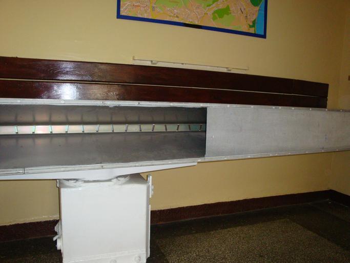 | Keywords: Slot antena section2.jpg en Cross section of slotted waveguide antenna of S-band 2 - 4 GHz radar Exhibit in Gdynia Maritime School Poland This common type of marine radar antenna consists of a waveguide in a V-shaped metal reflector with many slots cut in it It radiates a narrow vertical fan-shaped beam of microwaves perhaps 15° high and 2-3° wide perpendicular to the long axis of the antenna When installed in a ship a motor in the white box below it rotates the bar-shaped antenna about a vertical axis scanning the beam around the horizon to search for other ships pl Przekrój przez antenę szczelinową radaru pasma S own Ciacho5 2009-09-05 Radar antennas Civilian ship radars Waveguide antennas |