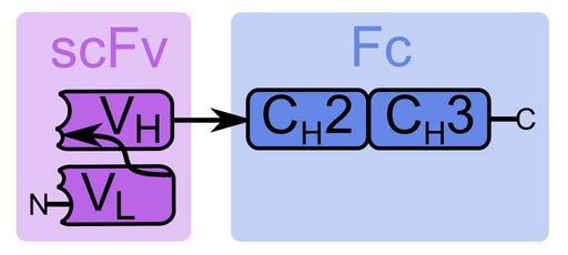 | Keywords: Small modular immunopharmaceutical.svg small modular immunopharmaceutical monomer scFv modified single-chain variable fragment <br /> Fc one half of a fragment crystallizable region <br /> V<sub>H</sub> Immunoglobulin heavy chain heavy chain variable domain V<sub>L</sub> Immunoglobulin light chain light chain variable domain C<sub>H</sub>2 constant domain 2 C<sub>H</sub>3 constant domain 3 effector domain Arrows linker peptide left and hinge region right own based on Cite journal Zhao X Lapalombella R ; Joshi; T et al 10 1182/blood-2006-12-062927 Targeting CD37-positive lymphoid malignancies with a novel engineered small modular immunopharmaceutical Blood 110 7 2569 “2577 2007 17440052 Anypodetos 2011-09-15 Drawing based on File Heavy chain and common antibody svg and File Single chain variable fragment svg Inkscape Cc-zero Antibodies |