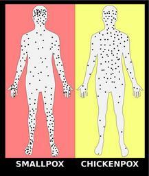 Keywords: Smallpox versus chickenpox english plain.svg Rash distribution early rash smallpox versus chickenpox en Image on left shows approximate distribution of smallpox rash Image on right shows approximate distribution of chickenpox rash Smallpox_ variola_orthopox_virus_ _Early_Rash_vs_chickenpox gif Human_body_silhouette svg 2011-01-27 17 27 UTC Smallpox_ variola_orthopox_virus_ _Early_Rash_vs_chickenpox gif Author Human_body_silhouette svg Upper_body_front png Mikael Häggström Background made transparent by Frédéric MICHEL for Graphic Lab fr derivative work RexxS <span class signature-talk >talk</span> derivative work Brammers <span class signature-talk >talk</span> Vaiolo VS Varicella svg left thumb 100px Without text thumb none 100px Variola and varicella instead of smallpox and chickenpox vectorised and replaced human body shape Brammers Smallpox_ variola_orthopox_virus_ _Early_Rash_vs_chickenpox gif 2009-10-29 11 59 UTC user Mikael Häggs</nowiki> Files by -Strogoff- Chickenpox Illustrations of smallpox |