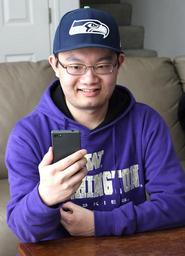 Keywords: smartphone male young phone texting cellphone mobile technology adult casual mobile phone man asian portrait online teenager social media internet indoors social hoodie cap glasses smile holding guy