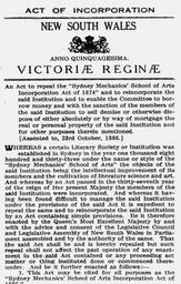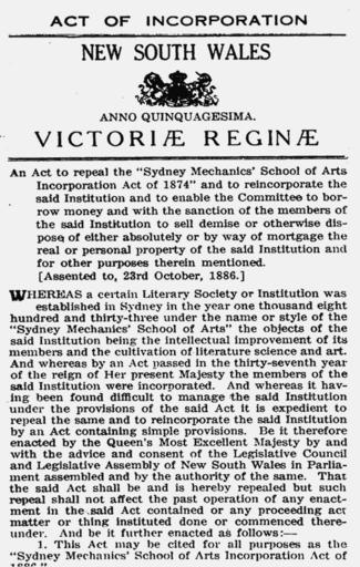 Keywords: SMSA Act of Incorporation.png en Text of the Act of NSW Parliament which repeals the Sydney Mechanics' School of Arts Incorporation act 1874 and reincorporates it in 1886 with the right to borrow money 1886-10-23 http //smsa org au/about/governance/ New South Wales Government PD-Australia PD-Scan Uploaded with UploadWizard Sydney Mechanics' School of Arts Parliament of New South Wales 1886 in Australia |