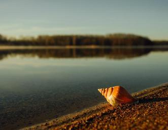 Keywords: snail shell lakeside water beach shore sand shell macro closeup blurred background calm tranquil glassy reflection cone natural animal