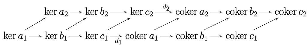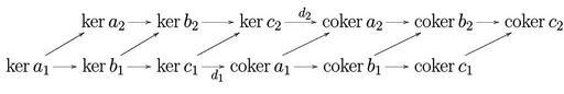 | Keywords: Snake lemma nat2.svg exact rows showing the naturality of the snake lemma Produced with TeX and XY-Pic using the source code below Both the image and the source code are in the public domain <pre> Produce a postscript file from this input with tex and dvips Loading the XY-Pic package \input xy \xyoption all Using postscript driver for smoother curves \xyoption ps \xyoption dvips No need for page numbers \nopagenumbers \def\coker \mathop \rm coker \xymatrix Our diagram is a 2x7 matrix \ker a_2\arr \ker b_2\arr \ker c_2\arr d_2 \coker a_2\arr \coker b_2\arr \coker c_2\\ \ker a_1\arr\arur \ker b_1\arr\arur \ker c_1\arr d_1 \arur \coker a_1\arr\arur \coker b_1\arr\arur \coker c_1\arur \end </pre> http //en wikipedia org/wiki/Image Snake_lemma_nat2 png Axel Boldt 2004-01-29 Both the image and the source code are in the public domain and Since I believe that intellectual property rights do not exist as we mere mortals cannot arrogate the right to own parts of Plato's eternal heaven of ideas every word I write is by default and always in the public domain http //en wikipedia org/wiki/User AxelBoldt toccolours collapsible collapsed width 80 style text-align left LaTeX Code to generate the current version - <source lang latex > See Descripion for the TeX code One needs PDF2SVG to generate the SVG image Author Axel Boldt Hagman Ika Update Date 11/15/2014 \documentclass amsart \usepackagepaperwidth 600px paperheight 100px top -10px left 0px right 0px bottom 0px geometry \usepackage amsmath amssymb nopageno \usepackageall xy \begin document \Huge \def\coker \mathop \rm coker \ \xymatrix Our diagram is a 2x7 matrix \ker a_2\arr \ker b_2\arr \ker c_2\arr d_2 \coker a_2\arr \coker b_2\arr \coker c_2\\ \ker a_1\arr\arur \ker b_1\arr\arur \ker c_1\arr_ d_1 \arur \coker a_1\arr\arur \coker b_1\arr\arur \coker c_1\arur \ \end document </source> Complexes algebra Xy-pic diagrams Images with LaTeX source code |
