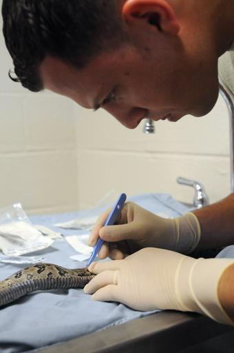 Keywords: Snake Surgery DVIDS279952.jpg en Army Sgt Ardicio Galvao animal care non-commissioned officer in-charge of the Guantanamo Bay Veterinary Treatment Facility makes a small incision in a Cuban Boa snake before inserting a tracking chip April 13 The clinic treats the pets of service members and Department of Defense employees assigned to Joint Task Force Guantanamo and U S Naval Station Guantanamo Bay 2010-05-13 Petty Officer 3rd Class Joshua Nistas https //www dvidshub net/image/279952 100513-N-+++++-073 2010-05-17 16 47 GUANTANAMO BAY CU PD-USGov-Military-Navy Naval Station Guantanamo Bay Joint Task Force Guantanamo Images from DoD uploaded by Fæ |