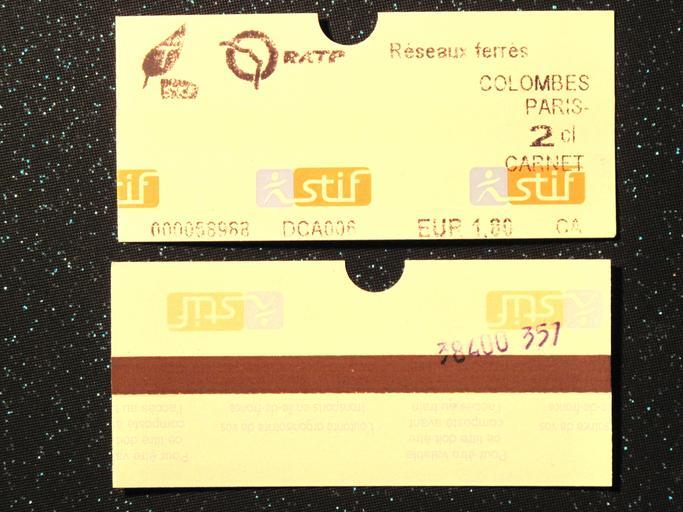 | Keywords: SNCF Paris suburb ticket.jpg en Recto and verso of a SNCF ticket for train in the suburb of Paris The printed numbers are 38400 the code for the train station gare Saint-Lazare where the ticket was punched and 357 the number of the day in the year déc-23 fr Recto et verso de ticket SNCF en banlieue parisienne Dans les chiffres compostés 38400 est le code de la gare Saint-Lazare où le billet a été composté et 357 le numéro du jour de l'année 23 déc own Tangopaso 2009-12-23 Commons Tangopaso Rail tickets of Île-de-France |
