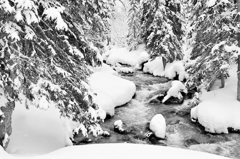 Keywords: snow alps haute-savoie winter landscape mountain ski winter landscape nature high alps white france snowy courchevel les 3 vallées fir sky clouds torrent water