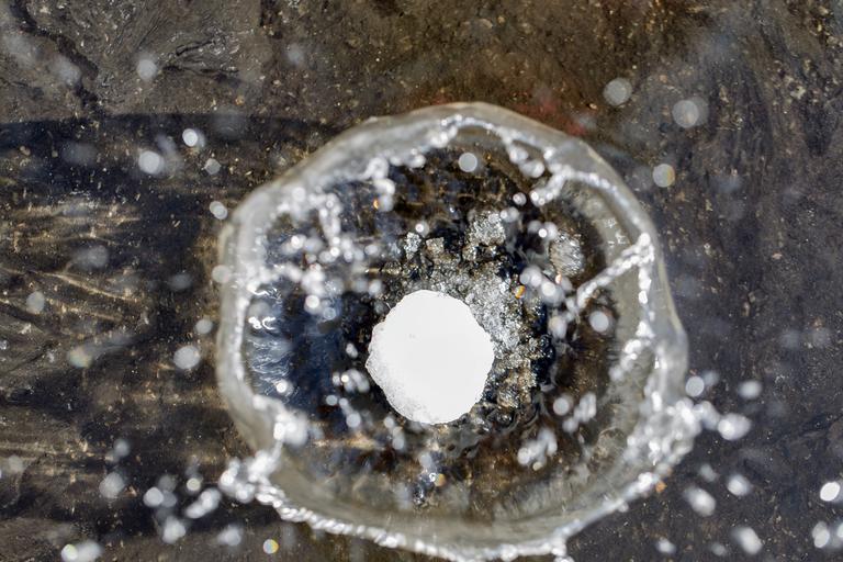 Keywords: snow ball splash puddle water contact closeup ring rise crater effect crater wet splashing