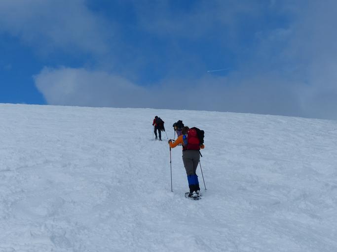 Keywords: snow shoe trek snow shoes winter snow winter tour winter trip traces cold nice weather sky blue human people wanderer more hiking tour exhausting backpack sticks winter sports