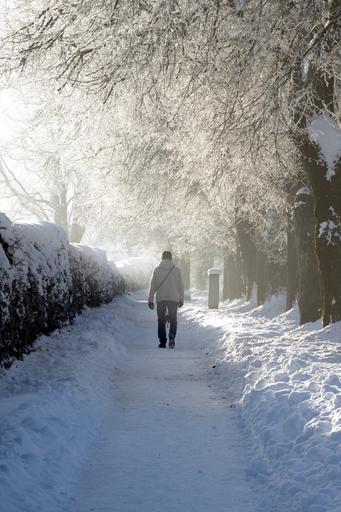Keywords: snow winter away person human wintry walk go white snowy forest trees branches icy sunny light atmospheric lichtspiel