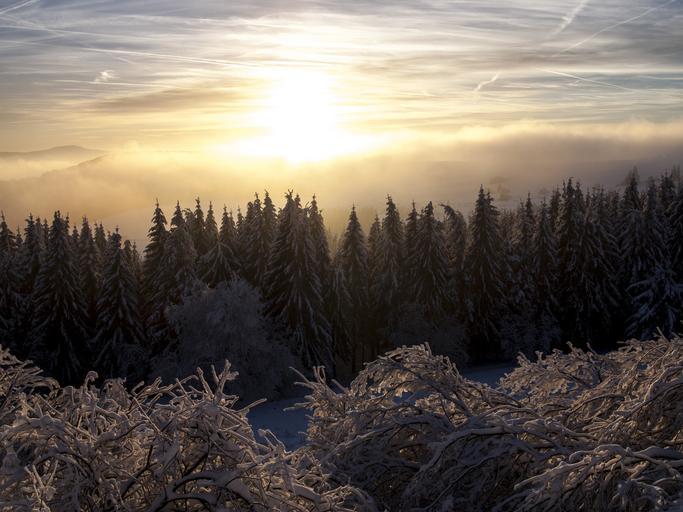 Keywords: snow winter trees light sun wintry cold ice frost icy sunset panorama