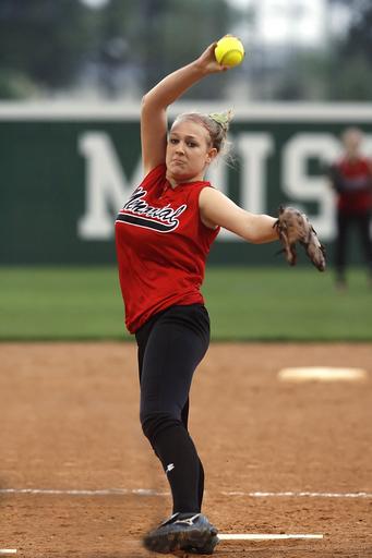 Keywords: softball pitcher female action pitching pitcher's mound infield ball park field game competition player play sport ballgame match ball throwing girl teen teenager competitor