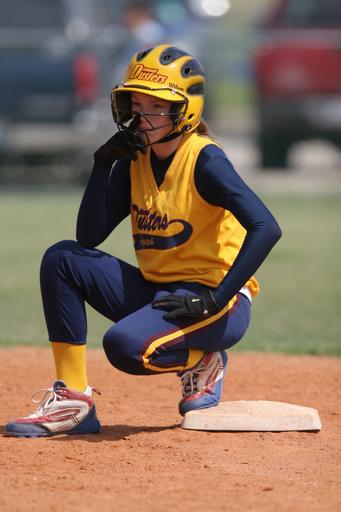 Keywords: softball player runner girl game competition base waiting playing sport infield helmet uniform female play action