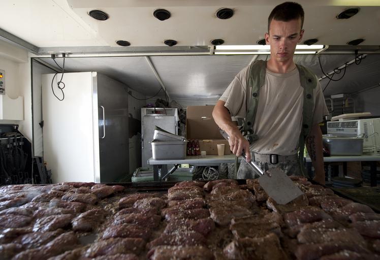 | Keywords: Soldier cooking up a feast 140820-D-KZ697-592.jpg en It was a hot Mojave Desert day for Soldiers training here but that didn't stop Spc Christian Dryer 22 from Vancouver Wash from cooking up a feast for troops Inside the field kitchen temperatures soared into the low three-digits as he worked on grilled steaks mashed potatoes and veggies I'm used to the dry heat said Dryer I spent six months in Afghanistan so this isn't that bad Photo by G A Volb/Fort Irwin Public Affairs 2014-08-20 Guy Volb https //www dvidshub net/image/1535094 140820-D-KZ697-592 2014-09-04 18 27 FORT IRWIN CA US PD-USGov Fort Irwin Military Reservation Images from DoD uploaded by Fæ |