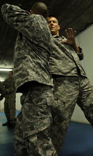 Keywords: Soldiers attend light fighter combatives course DVIDS165912.jpg en Command Sgt Maj James Redmore Multi-National Division - South senior enlisted leader practices a 10th Mountain Division light fighter combatives drill with a Soldier during a class held at Camp Victory recently 2009-04-18 Spc Tyler Maulding https //www dvidshub net/image/165912 165912 2009-04-18 10 54 CONTENGENCY OPERATING BASE BASRA IQ PD-USGov Camp Victory Images from DoD uploaded by Fæ |