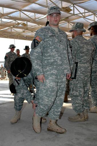 | Keywords: Soldiers don golden spurs DVIDS63282.jpg en Traverse City Mich native Col Dan Shanahan commander of the 1st Air Cavalry Brigade Warriors 1st Cavalry Division bends down to attach golden spurs to the boots of Pittsburg Pa native Spc Richard Clawson a human resources specialist for the 1st ACB during a spur ceremony at Camp Taji Iraq Oct 29 Clawson along with the others who donned their spurs will be headed back to the states soon as the rest of the Warriors finish up their 15 month deployment Clawson said he is going to take it one day at a time and spend time with the family when he returns home The gold spurs indicate a Soldier has deployed to a war zone as a member of a cavalry unit; they're worn during ceremonies and special events along with the Stetson 2007-10-31 Staff Sgt Nathan Hoskins https //www dvidshub net/image/63282 63282 2007-10-31 09 54 TAJI IQ PD-USGov 1st Cavalry Division United States Camp Taji Images from DoD uploaded by Fæ |