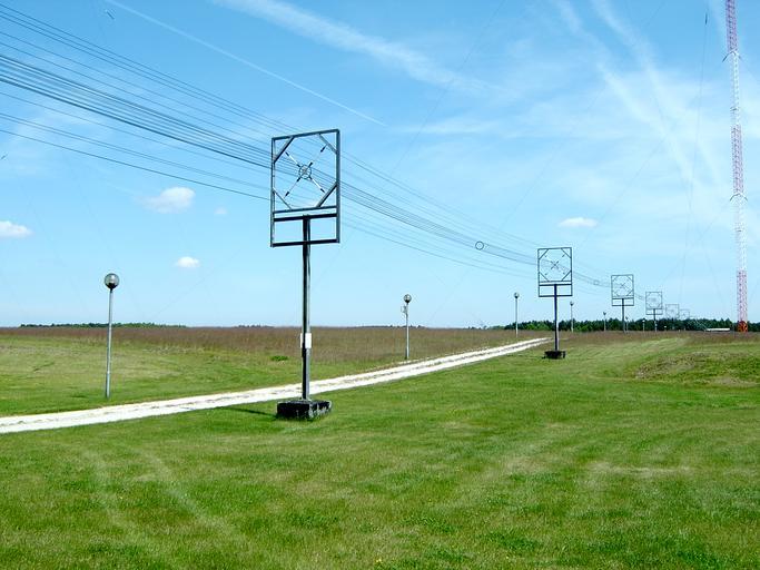 | Keywords: Solec Kujawski longwave antenna feeder.jpg Picture of antenna feeder line from longwave radio transmitter in Solec Kujawski Poland The aerial mast of the station which broadcasts at 225 kHz with a radiated power of 1200 kilowatts is visible in the background This type of transmission line is called a cage line and is used for high power low frequency transmission lines It functions similarly to a large coaxial cable The inner bundle of wires and the outer ring of wires carry equal magnitude and opposite phase RF currents to the antenna The outer ring of wires is connected to ground and serves as a shield own 2006-06-30 Przemysław Frasunek User Venglin Public domain 53 1 8 18 N 18 15 29 85 E region PL Solec Kujawski radio transmitter Cage lines |