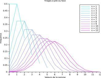 | Keywords: Somme n tirages pile ou face 1 a 12.svg fr Fréquence d'apparition d'une valeur pour la somme de n tirages à pile ou face Illustration du théorème central limite Créé avec Scilab modifié avec Inkscape en Frequency of occurrence of values for the sum of n coin flippings Illustration of the central limit theorem Created with Scilab modified with Inkscape 2013-06-18 11 25 14 own Cdang cdang Scilab source <source lang scilab > // Trace la fonction de densité de la moyenne de n tirages à pile ou face // initialisation clear; clf; nbmax 12; // nombre max de tirages cmap coolcolormap nbmax ; xset colormap cmap ; // Fonctions function frequences tirages n // calcule les fréquences de n tirage à pile ou face par dénombrement // entrées n nombre de tirages entier // sorties frequences matrice de fréquences réels N 2 n; // nombre de valeurs possibles resultats zeros N n ; // initialisation résultats des tirages for i 1 n // n° de colonne k 2 n - i ; //à la colonne i on alterne k valeurs 0 et k valeurs 1 for j 0 2 i - 1 - 1 resultats 2 j k + 1 2 j + 1 k i 0; resultats 2 j + 1 k + 1 2 j + 2 k i 1; end end //disp resultats ; somme sum resultats c ; frequences_non_triees tabul somme ; frequences gsort frequences_non_triees lr i ; frequences 2 frequences 2 /N; // normalisation des fréquences endfunction // Programme principal for i 1 nbmax XY tirages i ; plot2d XY 1 XY 2 style i end axe gca ; xtitle Tirages à pile ou face Valeurs de la somme Fréquence legend n 1 n 2 n 3 n 4 n 5 n 6 n 7 n 8 n 9 n 10 n 11 n 12 </source> cc-zero Uploaded with UploadWizard Coin flipping Central limit theorem |