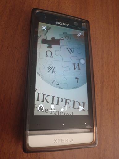 Keywords: Sony Xperia U.JPG en A picture of a Sony Xperia U sitting on a wooden desk displaying a picture of the Wikipedia logo in the Snapchat app 2014-03-17 17 42 46 own Olliechick cc-zero Uploaded with UploadWizard Sony Xperia U