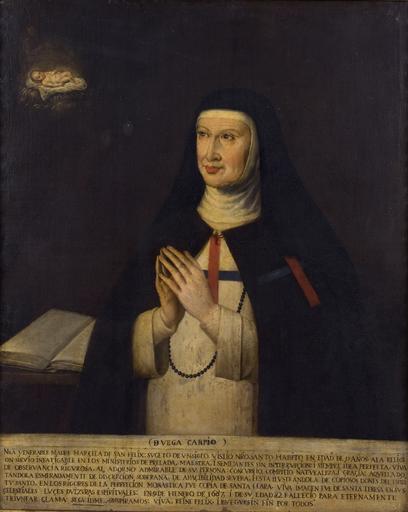 | Keywords: Sor Marcela de San Félix (Casa-museo de Lope de Vega).jpg Retrato de Sor Marcela de San Félix 1605-1687 que fue una escritora y monja trinitaria y era hija del célebre dramaturgo Félix Lope de Vega y Carpio El retrato se encuentra en la Casa-Museo de Lope de Vega y Sor Marcela aparece vestida con el hábito de la Orden de las Trinitarias y en el pecho y en su hombro izquierdo aparece la cruz azul y roja de los Trinitarios Las manos de la retratada aparecen juntas y en posición orante mientras que su vista está puesta en el Niño Jesús que se halla en la parte superior izquierda y descansando sobre una sabanilla colocada sobre un lecho de paja Ca 1635-1688 oil canvas Size cm 85 105 Convento de las Trinitarias Descalzas de Madrid España Depositado en la Institution Casa-Museo de Lope de Vega http //ceres mcu es/pages/Main object history exhibition history credit line En la parte inferior del lienzo está colocada la siguiente inscripción « DE VEGA CARPIO / NRA VENERABLE MADRE MARÇELA DE SAN FELIX SVGETO DE VN SIGLO VISTIO NRO SANTO HABITO EN EDAD DE 15 AÑOS ALA RELIGI / ON SIRVIO INFATIGABLE EN LOS MINISTERIOS DE PRELADA MAESTRA I SEMEJANTES SIN INTERRVPÇION I SIEMPRE IDEA PERFEETA VIVA / DE OBSERVANCIA RIGVROSA AL ADORNO ADMIRABLE DE SV PERSONA CONCVRRIO COMPITIO NATVRALEZA I GRAÇIA AQVELLA DO / TANDOLA ESMERADAMENTE DE DISCRECION SOBERANA DE APACIBILIDAD SEVERA; I ESTA ILVSTRANDOLA DE COPIOSOS DONES DEL ESPIRI / TV SANTO EN LOS RIGORES DE LA PERFEECION MONASTICA FVE COPIA DE SANTA CLARA VIVA IMAGEN FVE DE SANTA TERESA EN SVS / CELESTIALES LVÇES DVLZVRAS ESPIRITVALES EN 9 DE HENERO DE 1687 I DE SV EDAD 82 FALLECIO PARA ETERNAMENTE / TRIVNFAR CLAMA SEGVIDME SVSPIRAMOS VIVA REINE FELIX RVEGVE SIN FIN POR TODOS» accession number CE00098 http //www bne es/es/Micrositios/Exposiciones/Escritoras/Exposicion/Seccion6/Obra15 html origen galeria PD-old-100 Uploaded with UploadWizard Marcela de San Félix Convento de las Trinitarias Descalzas Madrid Paintings in the Lope de Vega House-Museum Madrid |