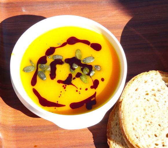 Keywords: soup meal food cooked enjoy lunch pumpkin soup dine warm slice of bread