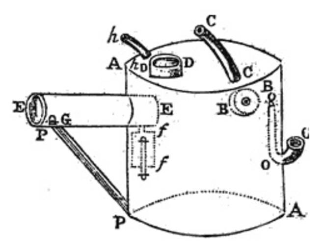 Keywords: Sous-marin, Papin.jpg Le deuxième modèle de sous-marin de Papin la coque est de forme ovale afin de résister naturellement à la pression de l'eau les deux tuyaux sur le haut de la coque sont portés à la surface par une vessie flottante non représentée sur ce dessin A la base d'un de ces tuyaux on voit la représentation du soufflet de hesse pompe à air centrifuge qui assure le renouvellement de l'air dans l'habitacle Dans le tube horizontal qui est un volume pressurisé séparé un homme pouvait se tenir allongé il était alimenté en air par une pompe et il pouvait passer un bras à l'extérieur et ruiner à la main les coques ennemies PD-old Denis Papin |