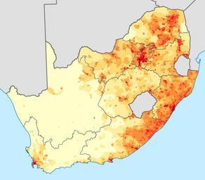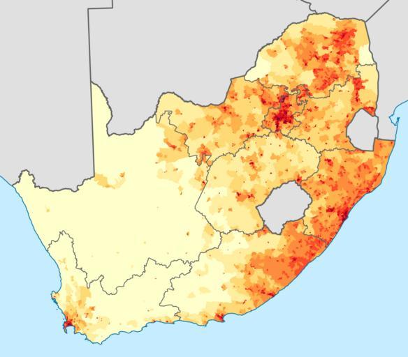| Keywords: South Africa 2011 Black African population density map.svg ffffcc <1 person/km² ffeda0 1 “3 people/km² fed976 3 “10 people/km² feb24c 10 “30 people/km² fd8d3c 30 “100 people/km² fc4e2a 100 “300 people/km² e31a1c 300 “1000 people/km² bc0026 1000 “3000 people/km² 800026 >3000 people/km² Projection is Albers Equal-Area Conic with standard parallels at 25 5° S and 31 5° S and origin at 28 5° S 25 5° E Statistics South Africa's Census 2011 is the source of the basic population data The map results from my own processing of the data For ward boundaries see File South Africa electoral wards 2011 blank svg Htonl 2013-04-16 Demographic maps of South Africa Maps with Albers projection Maps by Htonl The following license applies to the population data on which the map is based http //www statssa gov za/copyrightdisclaimer asp the user acknowledges Stats SA as the source of the basic data wherever they process apply utilise publish or distribute the data and also that they specify that the relevant application and analysis where applicable result from their own processing of the data The following applies to the map itself |