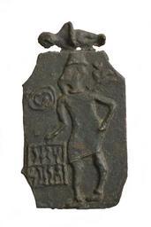 | Keywords: South Arabian - Plaque of a Man - Walters 20071735.jpg  This unique plaque depicts a man dressed in a thigh-length costume and shoes He wears headgear used by hunters and traders A serpent is coiled in front of his face and a bird perhaps an eagle with outspread wings emerges from behind his shoulders Serpents and eagles in South Arabian art are associated with the sun and moon On top of the plaque a female figure wearing a long sheath-like dress is oriented horizontally and may represent a worshiper Text beside the man contains the given name Heshfer or Heshqer of the Serben clan century 2 1 BC bronze cm 17 8 10 0 5 accession number 2007 17 35 76494 Portobello Road Market London Giraud and Carolyn Foster Baltimore between 1963 and 1964 by purchase Walters Art Museum Gift of Giraud and Carolyn Foster 2007 Transliteration Hsfr or Hsqr Srbn Translation Heshfer or Heshqer of the Serben clan Faces of Ancient Arabia The Giraud and Carolyn Foster Collection of South Arabian Art The Walters Art Museum Baltimore 2008 place of origin Arabian Peninsula Walters Art Museum license South Arabian art in the Walters Art Museum Art of Saudi Arabia Media contributed by the Walters Art Museum needs category review |