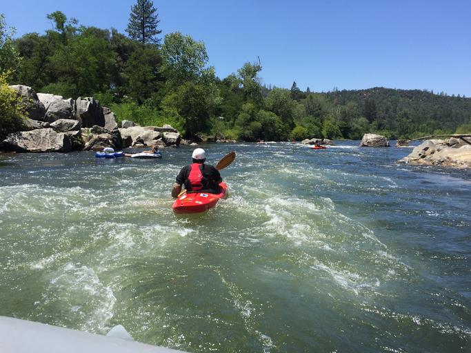 Keywords: river nature outdoor travel boat boating rafting whitewater rafting whitewaterrafting kay kayaking beauty scenic california recreation water sun summer blmcareers america's great outdoors americasgreatoutdoors american river americanriver history mountains sport swim The Gold Rush River, the South Fork of the American River, today still delivers its own special currency as the most popular (and most populated) whitewater run in California. Even before James Marshall's fortuitous 1848 find in John Sutter's mill race, the Rio de los Americanos flaunted its reputation as a wild and capricious mountain stream. Today, tempered by upstream dams, the South Fork still lurches and bucks through cataracts of boulders, drops and chutes, on its headstrong plunge through Meatgrinder, Fowlers Rock, and Satan's Cesspool, then delivers a rough goodbye at Hospital Bar. Along with these heart-stopping rapids, you'll no doubt come to shore long enough to do some discovering of your own at the Marshall Gold Discovery State Park. The 21 mile river run can be made in a full day or a more relaxing two day trip. Picnicking is available at the Dave Moore Nature Area which is accessible by automobile from Highway 49 or by boat on the river. Take US 50 to the town of Placerville, then follow Highway 49 to Highway 193 to the Chili Bar Reservoir. Highway 49 also runs through Coloma for river access at the Henningsen-Lotus Park. Put-in options include: Chili Bar, Henningsen-Lotus Park, Hwy. 49 Bridge West, Marshall Gold Discovery Park, Camp Lotus. Photo by Maria Thi Mai, BLM. The Gold Rush River, the South Fork of the American River, today still delivers its own special currency as the most popular (and most populated) whitewater run in California. Even before James Marshall's fortuitous 1848 find in John Sutter's mill race, the Rio de los Americanos flaunted its reputation as a wild and capricious mountain stream. Today, tempered by upstream dams, the South Fork still lurches and bucks through cataracts of boulders, drops and chutes, on its headstrong plunge through Meatgrinder, Fowlers Rock, and Satan's Cesspool, then delivers a rough goodbye at Hospital Bar. Along with these heart-stopping rapids, you'll no doubt come to shore long enough to do some discovering of your own at the Marshall Gold Discovery State Park. The 21 mile river run can be made in a full day or a more relaxing two day trip. Picnicking is available at the Dave Moore Nature Area which is accessible by automobile from Highway 49 or by boat on the river. Take US 50 to the town of Placerville, then follow Highway 49 to Highway 193 to the Chili Bar Reservoir. Highway 49 also runs through Coloma for river access at the Henningsen-Lotus Park. Put-in options include: Chili Bar, Henningsen-Lotus Park, Hwy. 49 Bridge West, Marshall Gold Discovery Park, Camp Lotus. Photo by Maria Thi Mai, BLM.