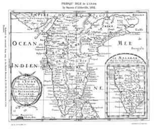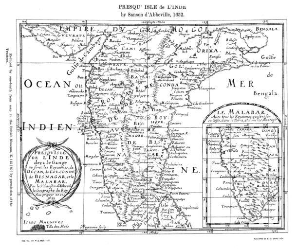 Keywords: South India Map 1652.jpg Map of Peninsular India by Sanson d'Abbeville 1652 Reprint in R H Phillimore 1945-58 Historical Records of Survey of India Vol 1-3 Survey of India 1652 Sanson d'Abbeville PD-old-100 Old maps of South India 1652 maps of India |