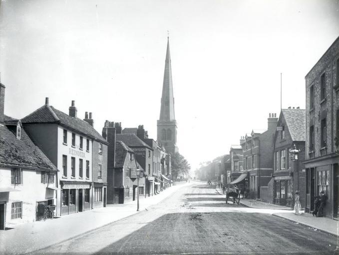 | Keywords: Southampton Street, Reading, c. 1891.jpg en Southampton Street Reading looking southwards c 1891 On the east side No 5; No 7; No 9 The Reindeer Inn advertising Hewett Sons' ales and stout ; No 11; the end of Mud Lane; No 13 The Little Crown Inn ; No 15 R Pyke grocer and pork butcher On the west side the corner of Mundesley Street; No 16; No 14; No 12 St Giles' Coffee House ; the corner of Katesgrove Lane; No 8 The Lord Clyde beerhouse 1890-1899 photograph by H W Taunt; glass negative Box 22 No 8576 1891 http //readingimages epixtech co uk/extra/test3 html Reading Borough Libraries Creator Henry Taunt PD-old-80 Southampton Street Reading St Giles' Church Reading Reading in the 1890s Henry Taunt 1891 in England 1891 photographs |